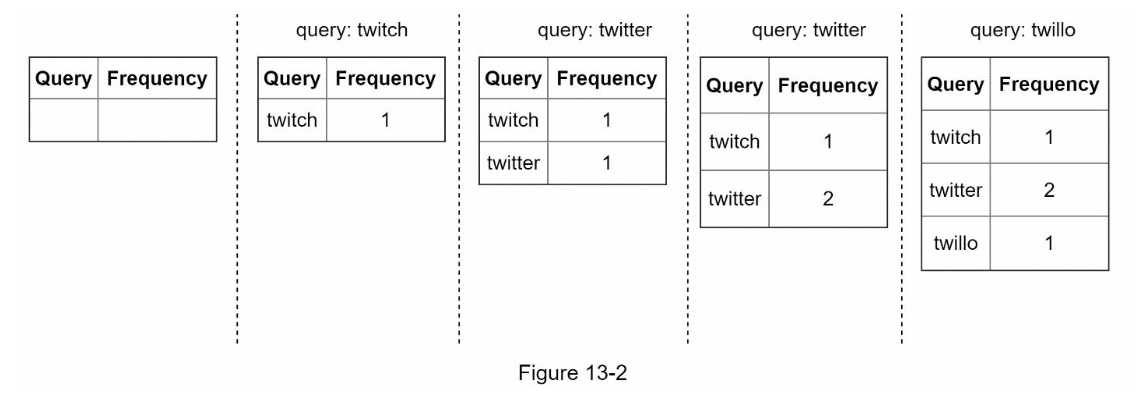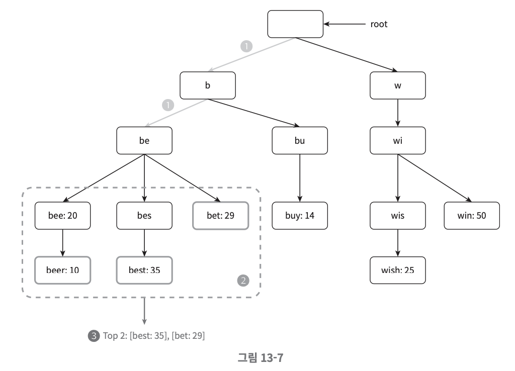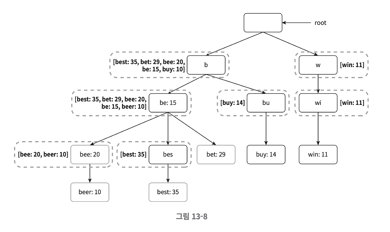 13장은 구글 검색 및 아마존 웹 사이트 검색창에 단어를 입력했을 때 입력 중인 글자에 맞는 검색어가 자동으로 완성되는 시스템에 대해 다룬다.