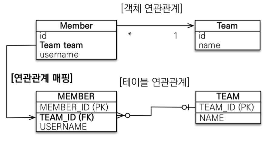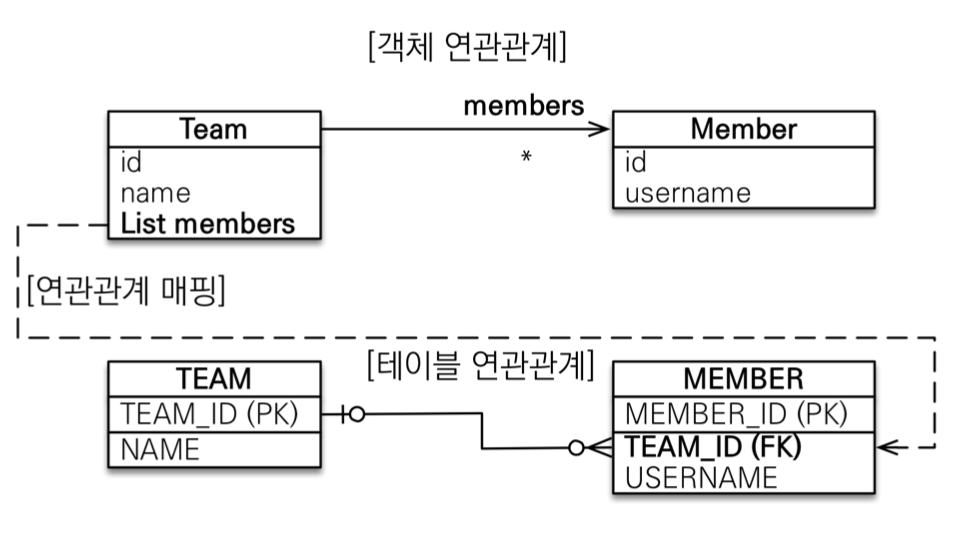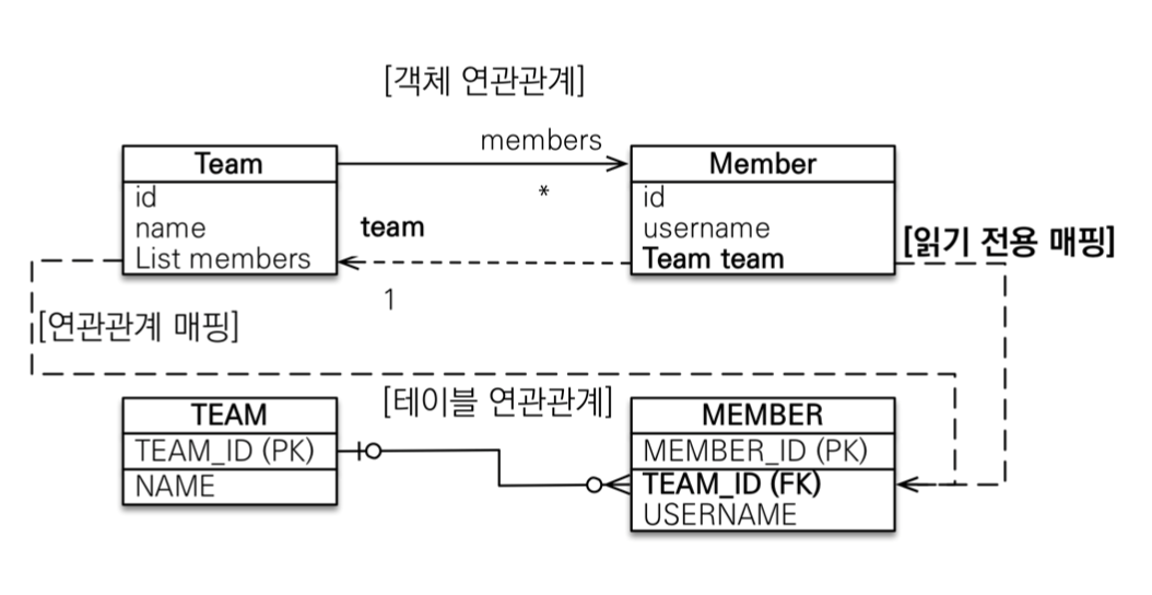 - 객체와 테이블의 차이 때문에 반대편 테이블의 외래 키를 관리하는 특이한 구조