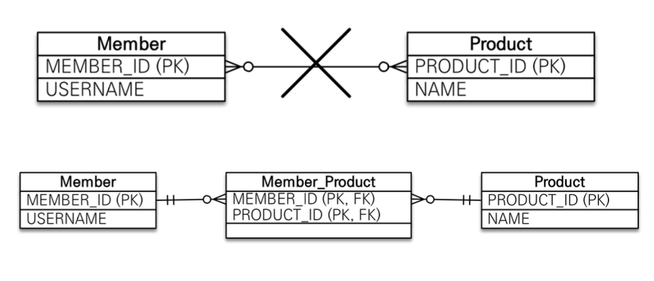 - RDBMS는 정규화된 테이블 2개를 다대다 관계를 표현할 수 없다.